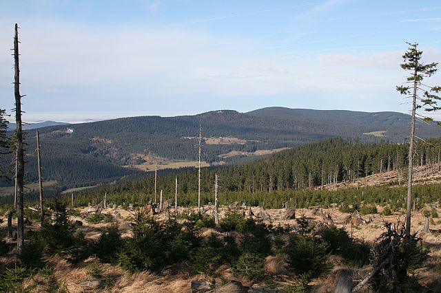 Pohled z vrcholu Mechového vrchu (VV 207a; 1013 m) k vrcholu Křemenné (HLV 207; 1085 m). Spojnice Mechového vrchu s Křemennou je tvořena téměř v celé délce výrazným hřebenem.