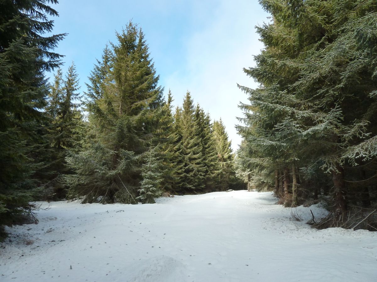 Ne příliš vzhledné suché smrky na vrcholu Svatý Jan (HLV 273; 1045 m).
